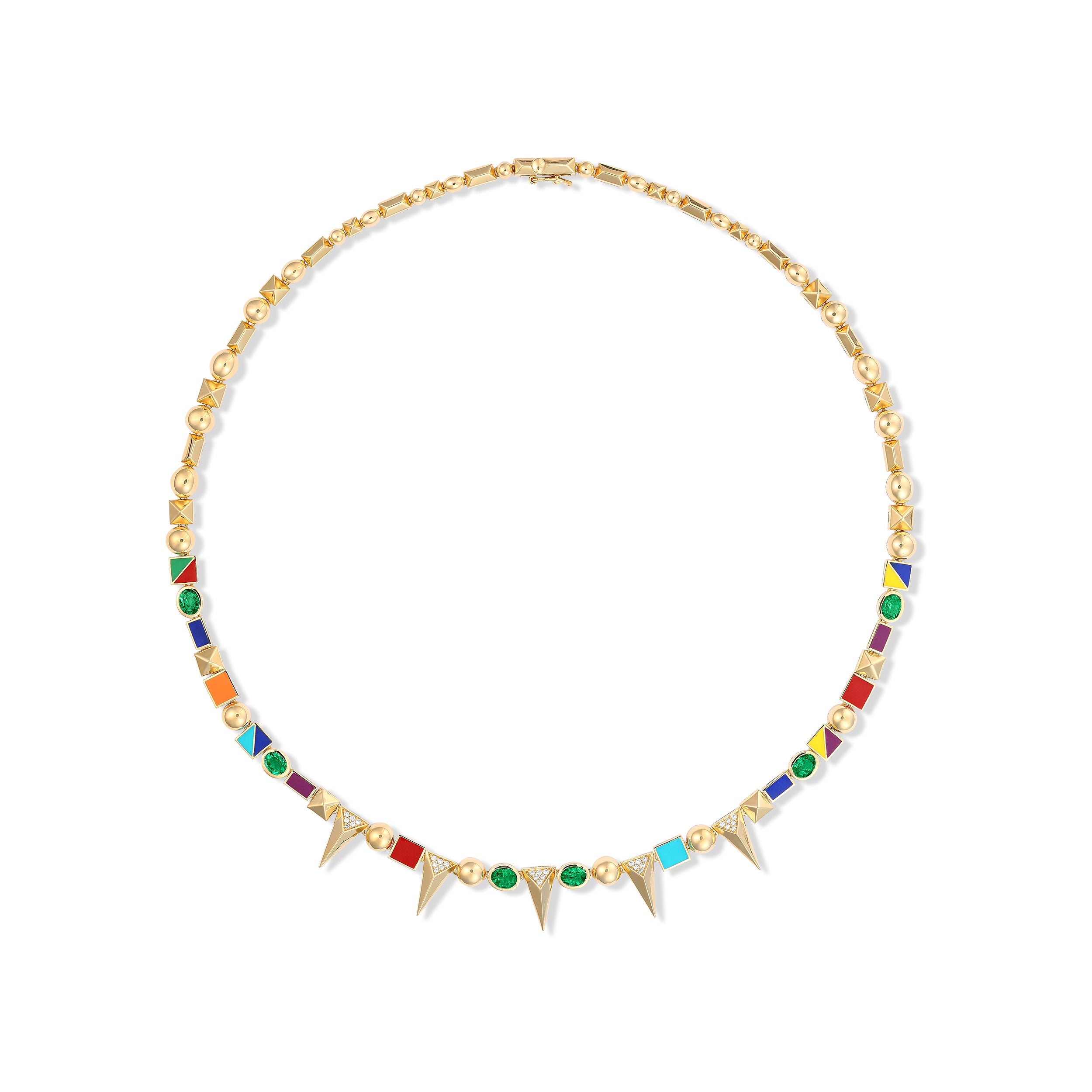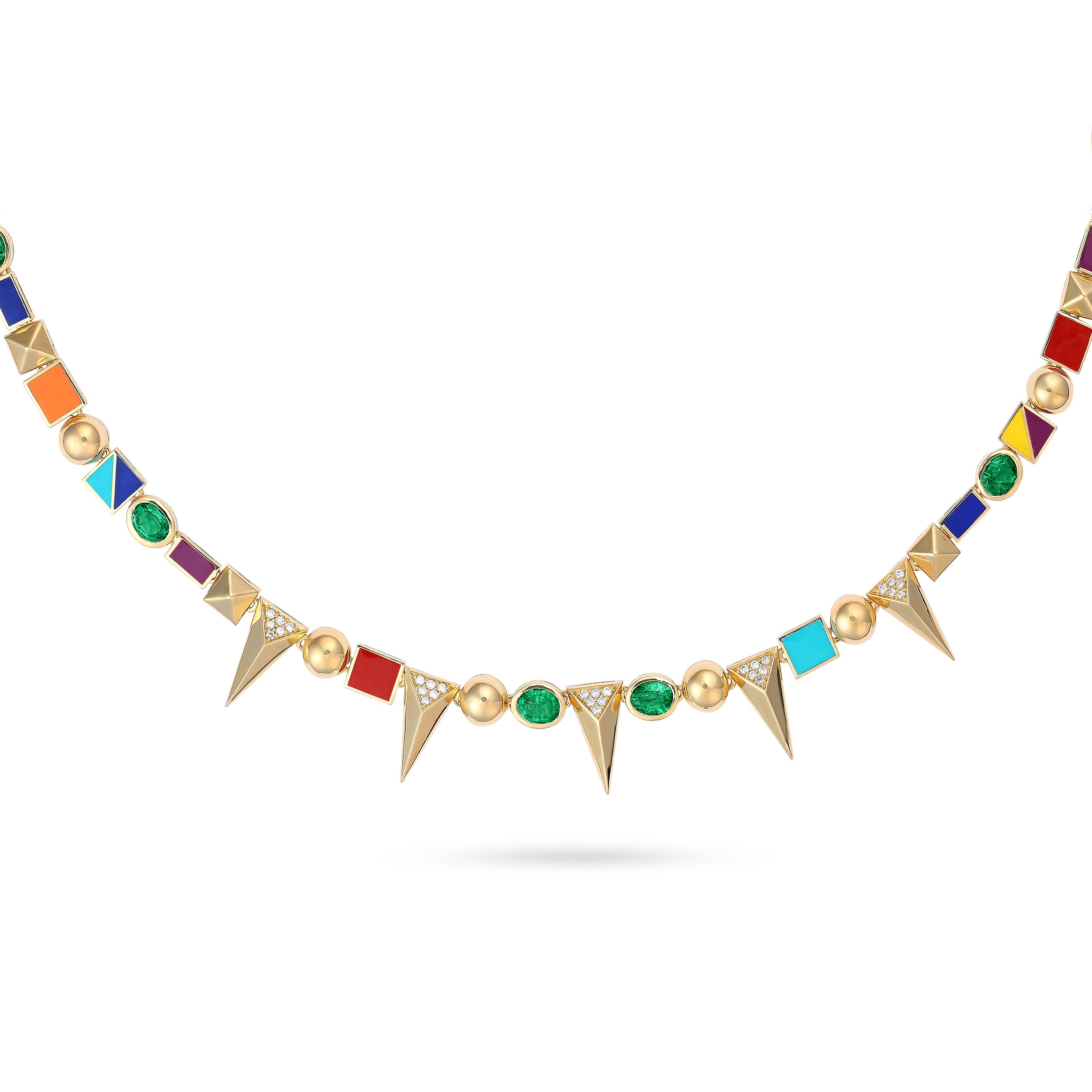 Make a bold statement with the Big Necklace from the Aurora Collection—an exquisite piece that fuses vibrant enamel with rich 18k yellow gold. Accented with ~1.6 ct of vivid green emeralds and ~0.120 ct of brilliant VS–SI diamonds, this necklace radiates color, elegance, and refined strength.
