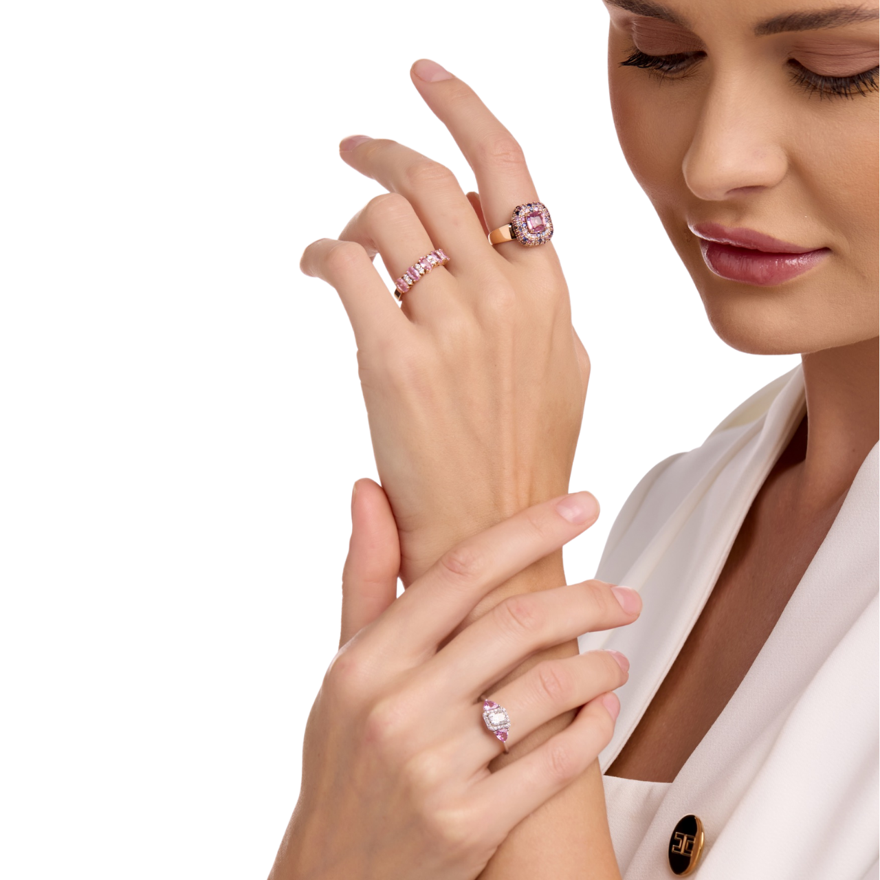 18k rose gold ring with 1.10ct unheated pink sapphire center stone, surrounded by multi-color sapphires.