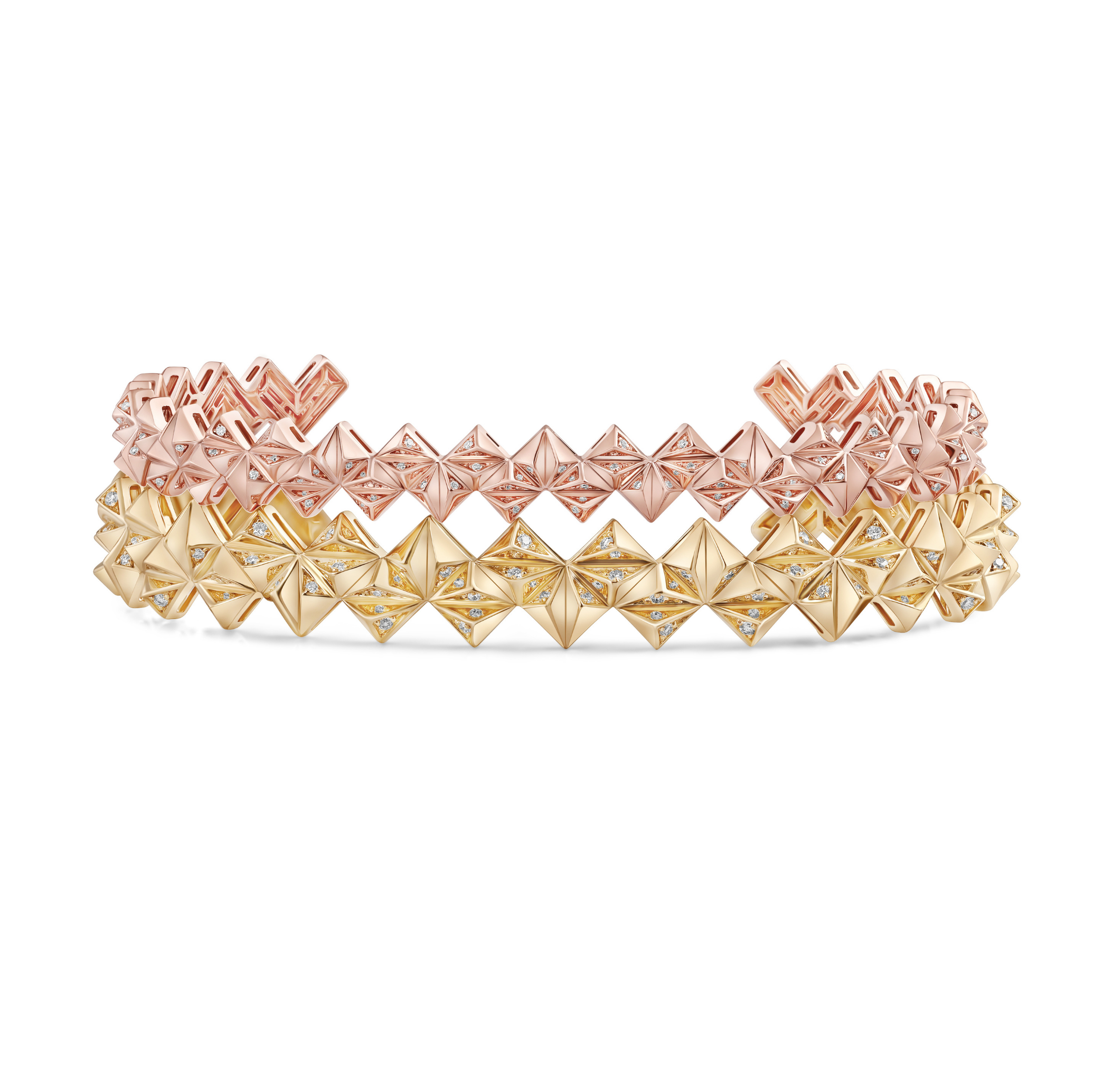 18K Yellow Gold (gross weight 17 – 19 g) VS/SI melee diamonds (Available in three thicknesses and three gold colors — yellow, white, and rose.