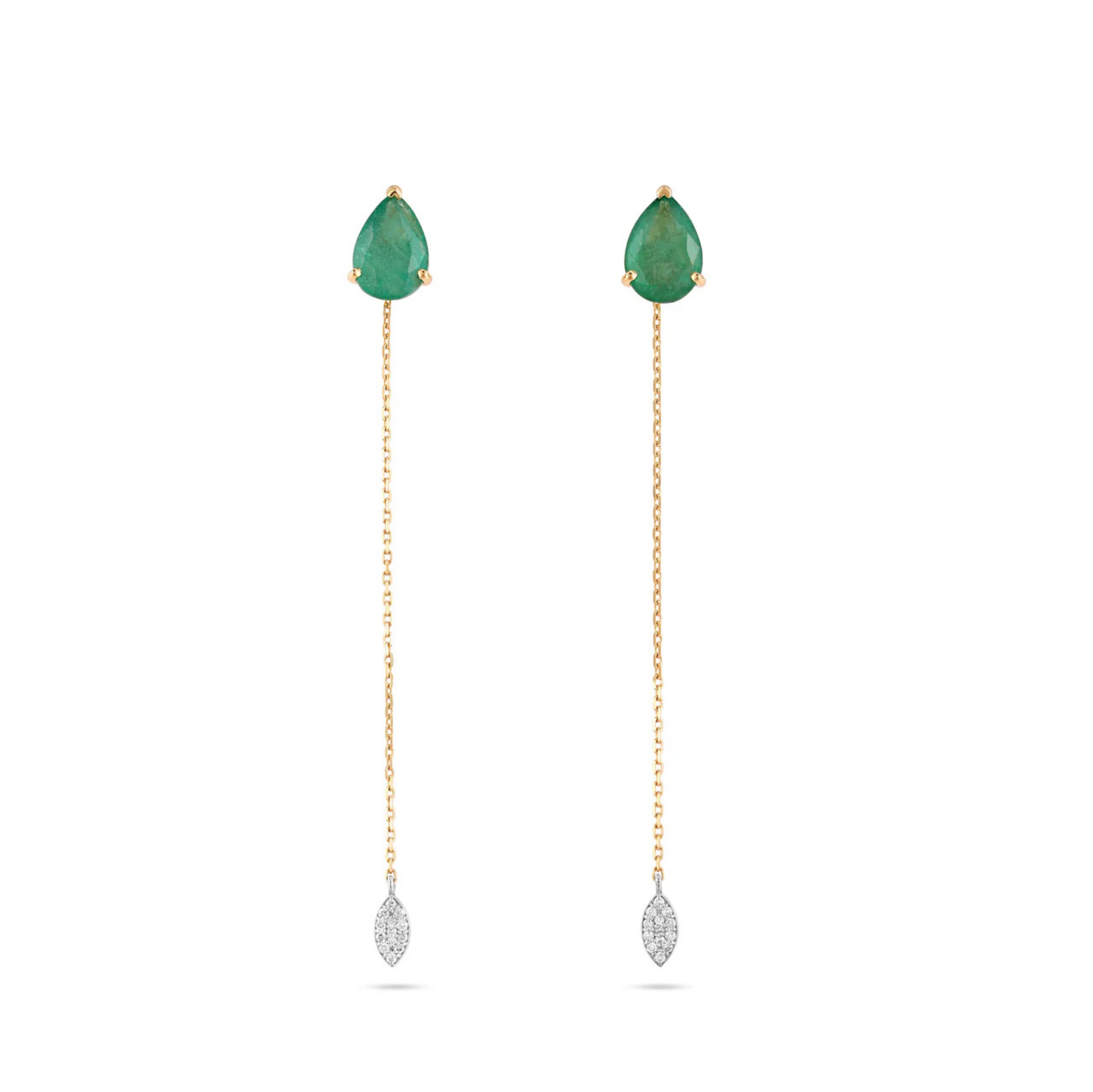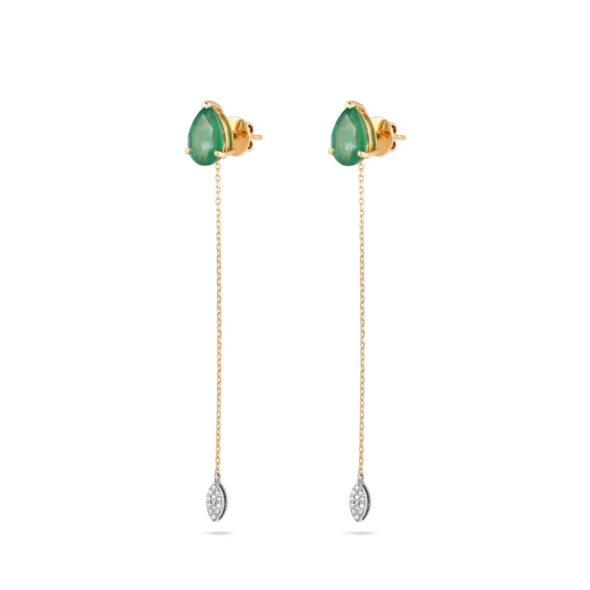 These exquisite earrings offer unmatched versatility, effortlessly transitioning from day to night. Worn as elegant solitaire studs by day, they transform with a delicate chain attachment for added evening sophistication. Crafted in a refined blend of white and yellow gold, they feature approximately 4 carats of natural emeralds and 0.12 carats of brilliant round diamonds.