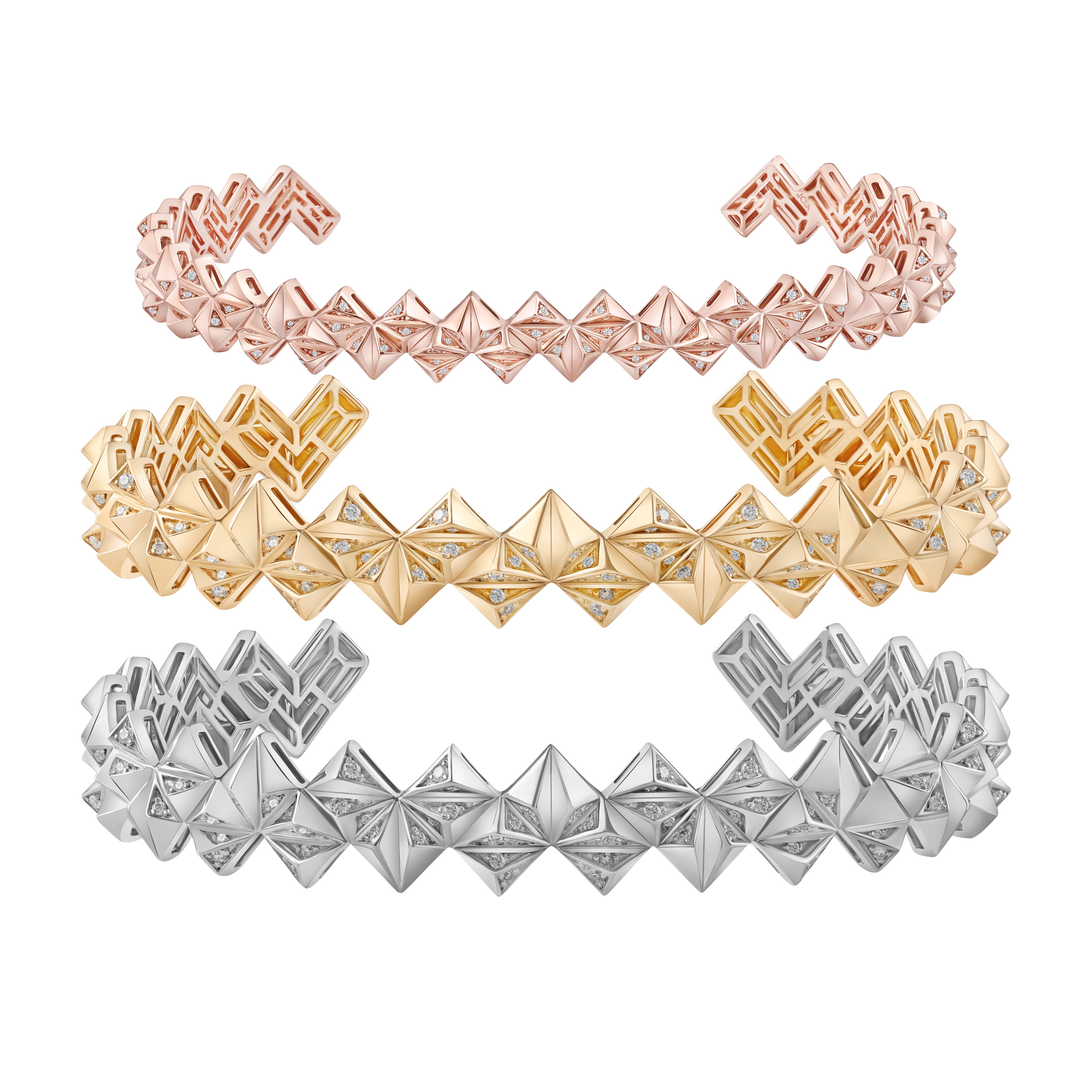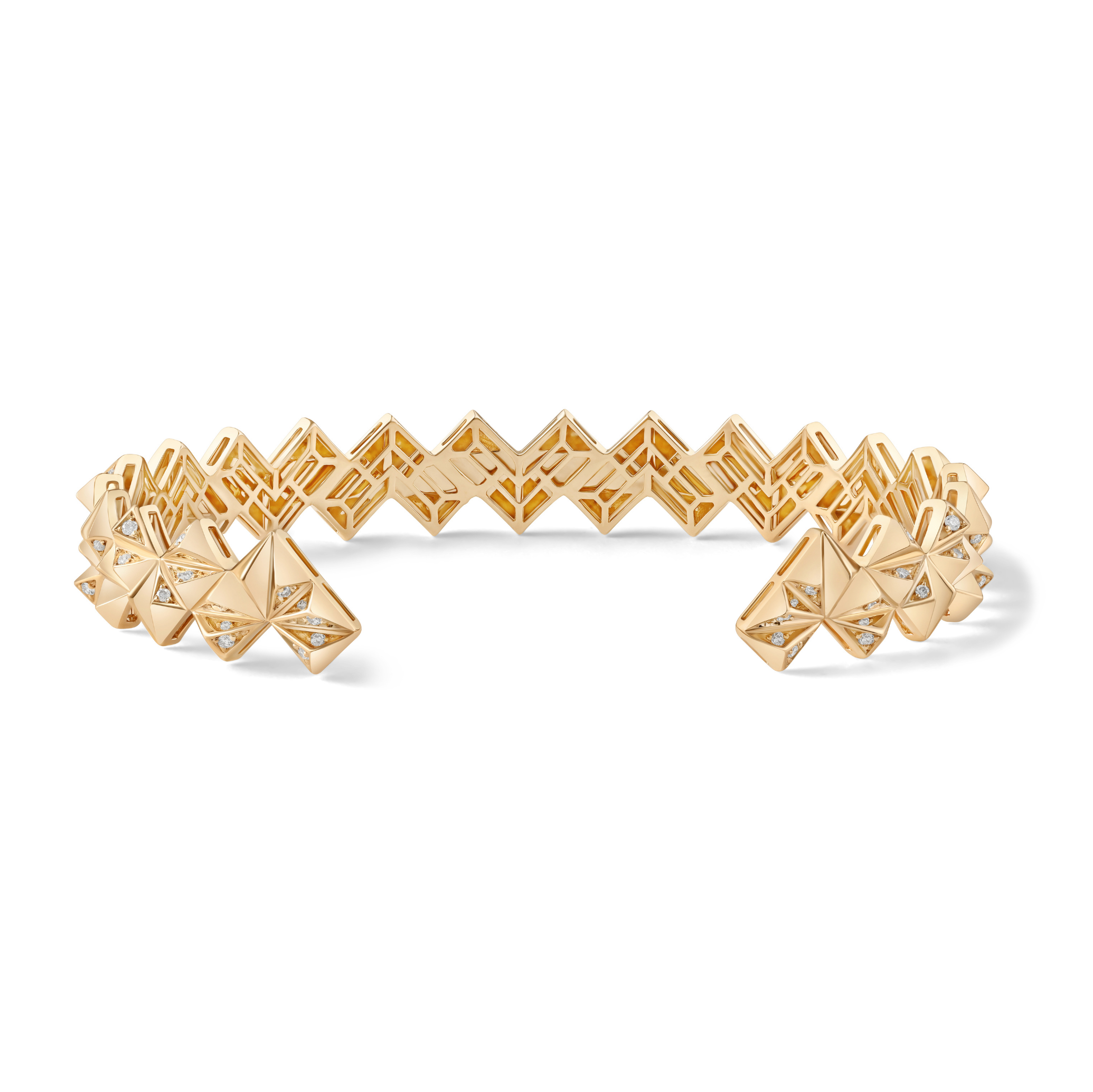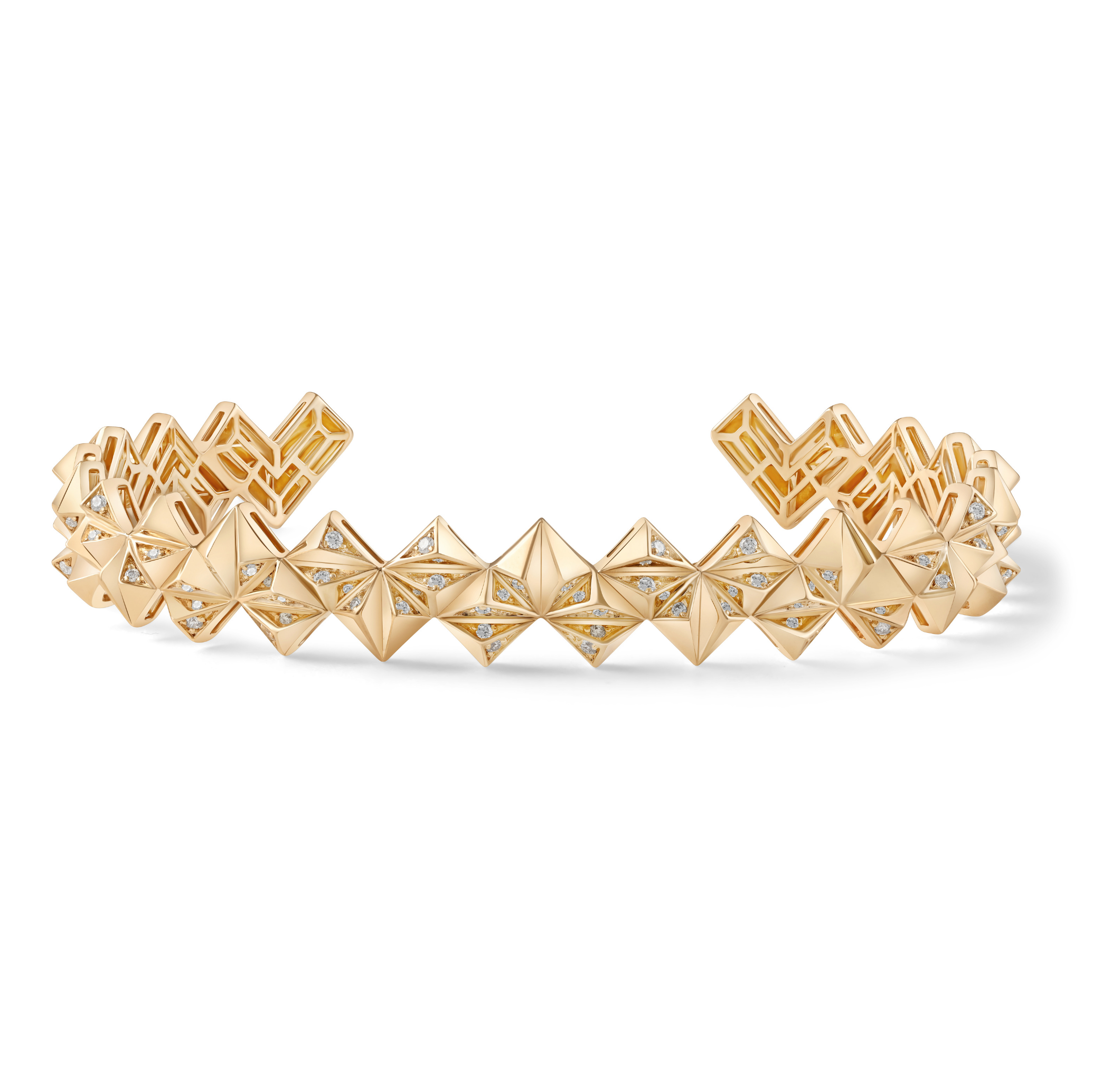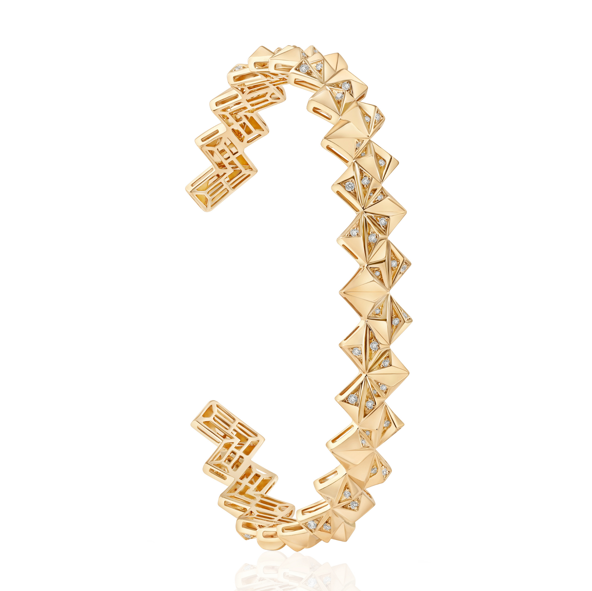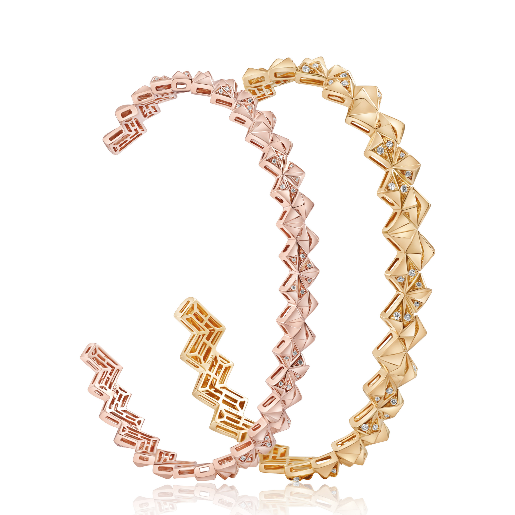 18K Yellow Gold (gross weight 17 – 19 g) VS/SI melee diamonds (Available in three thicknesses and three gold colors — yellow, white, and rose.
